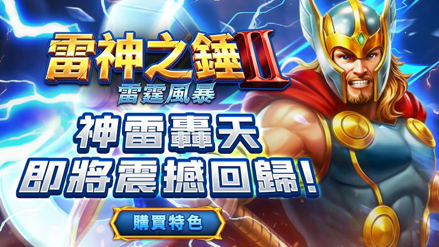 RSG最讓人期待的雷神強勢回歸!最強老虎機-雷神之錘 II 雷霆風暴,重磅來臨!舉起全新武器風暴終結者斧錘,發動神力一擊,萬倍爆獎瞬間點燃戰局,直衝極限勝利!在風雲怒湧的天際之巔,召喚強大雷霆閃電,超高倍數獎勵全面覺醒!隨著力量甦醒,雷電席捲盤面,每一次擊落都引發倍數升級,贏分連鎖爆發,威力層層疊加,勝利越戰越狂!不再只是歸來,而是全面進化的雷神,立即加入這場戰役,感受升級之力的極致快感!----- Royal Slot Gaming RSG 娛樂城合作首選